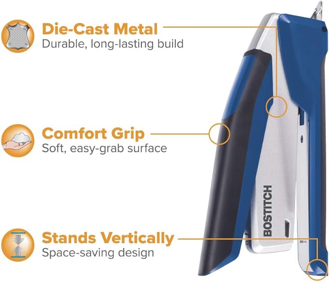 Bostitch Office InPower Spring-Powered Premium Desktop Stapler , 28 Sheet Capacity, One Finger, No Effort, Blue/Silver