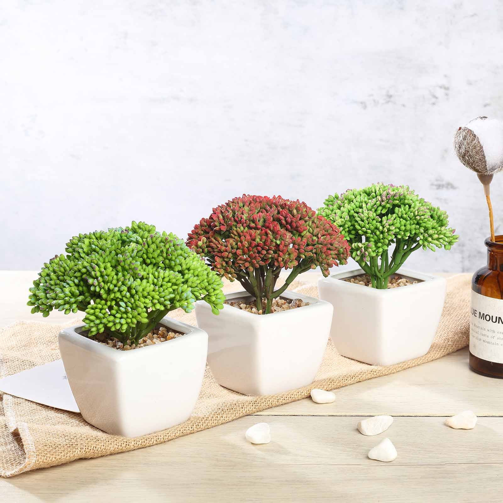 This set of 3 pots, containing artificial, but amazingly lifelike miniature succulent plants is ideal for adding a dash of refreshingly modern style to your home, office, or party decor. Cute ceramic pots are pre-filled with decorative rocks and succulents to give you a truly classy decorative accent fit for any space and season. Bring the freshness of natural green to your life and space by placing these faux cacti pots in your living room coffee table, dining table, kitchen counter, bathroom shelf, home garden ledge, or hang from tree branches, arches, columns, and poles for an elegant rustic touch. Besides home and office decoration, our everlasting faux Succulents also make an ideal decorative accent for Rustic Parties, Woodland, Southwestern, and Garden-themed Weddings and Events.