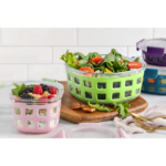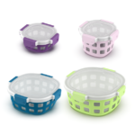 - Mighty Tough: Silicone sleeve protects glass and tabletops and provides a no-slip grip. Color coordinating lid and base make containers easy to spot and match. Clear lid lets you see what’s inside each container.