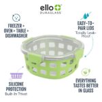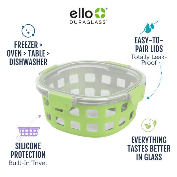 FRESH FOR LONGER. Equip your kitchen with the Ello Duraglass 8pc Mixed Size Round Glass Food Storage Container Set. This set of four glass containers comes with airtight locking lids so you can keep your food fresh for much longer. These containers are leak proof, stain-resistant and oven-safe with the lid off. The containers are protected from chips and breaks by a silicone sleeve. This meal prep set allows you to store food for a feast efficiently and easily.
