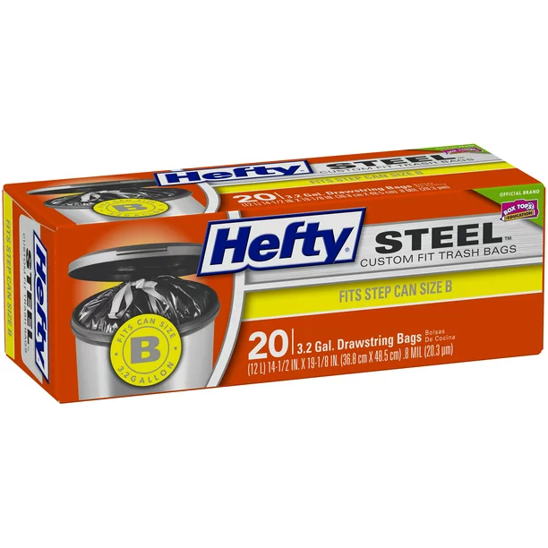 - 3.2 Gallon Garbage Bags—This package contains 20 Hefty Steel Custom Fit black, unscented, 3.2 gallon plastic trash bags