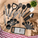 - Lux Decor 23 piece Black kitchen utensils set – One Complete Nylon set that supplies you with every kitchen tool and gadget that you need for a perfect cooking.