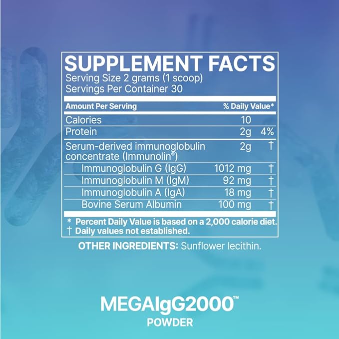 • Dairy-Free Bovine Immunoglobulin Concentrate – Unlike other milk derived IgG gut health products, Mega IgG2000 is derived from serum bovine immunoglobulin, making it lactose-free, casein-free, and B-lactoglobulin-free.