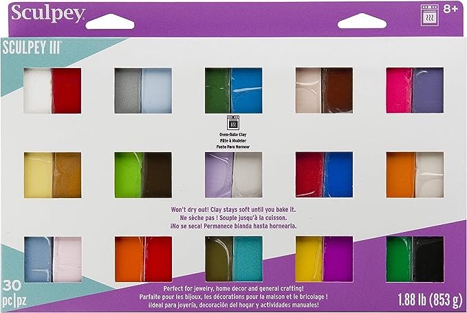 Sculpey III 30 Vibrant Colors of Polymer Oven-Bake Clay, Non Toxic 1.88 lbs., great for modeling, sculpting, holiday, DIY, mixed media and school projects. Great for all skill levels.